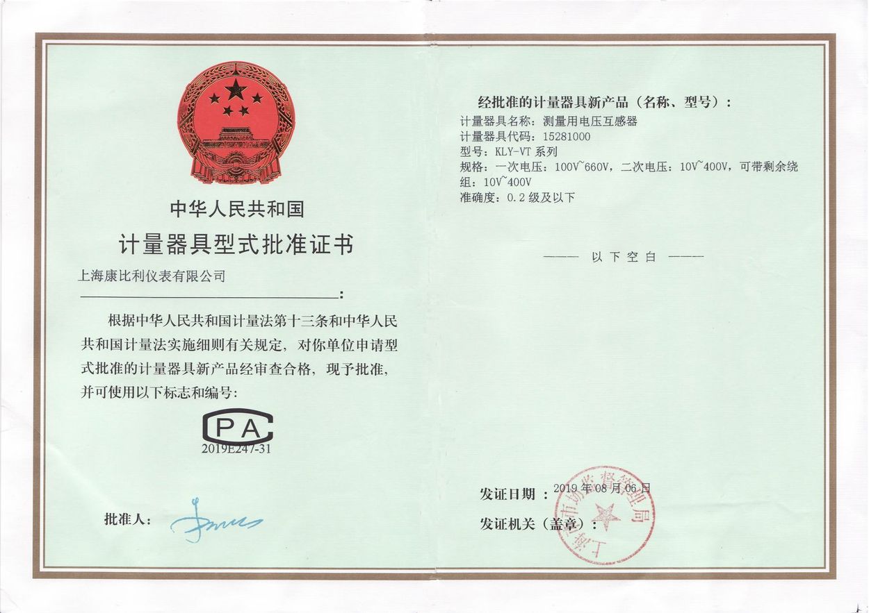 計量器具型式批準(zhǔn)證書-測量用電壓互感器